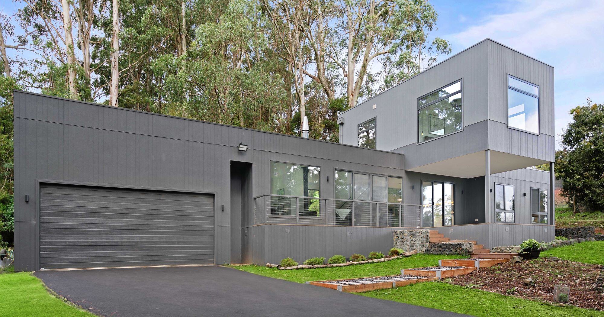 Nestled high up in the scenic Dandenong Ranges of Victoria, this custom-designed two-storey modular home finds its perfect setting in the charming town of Olinda.