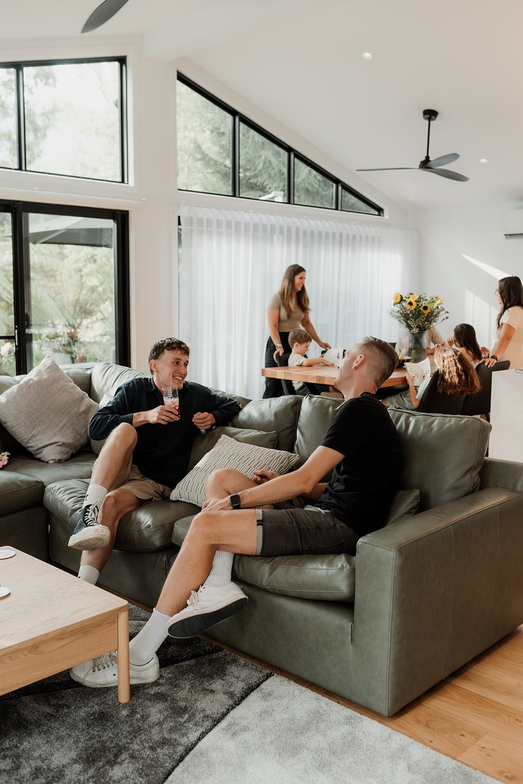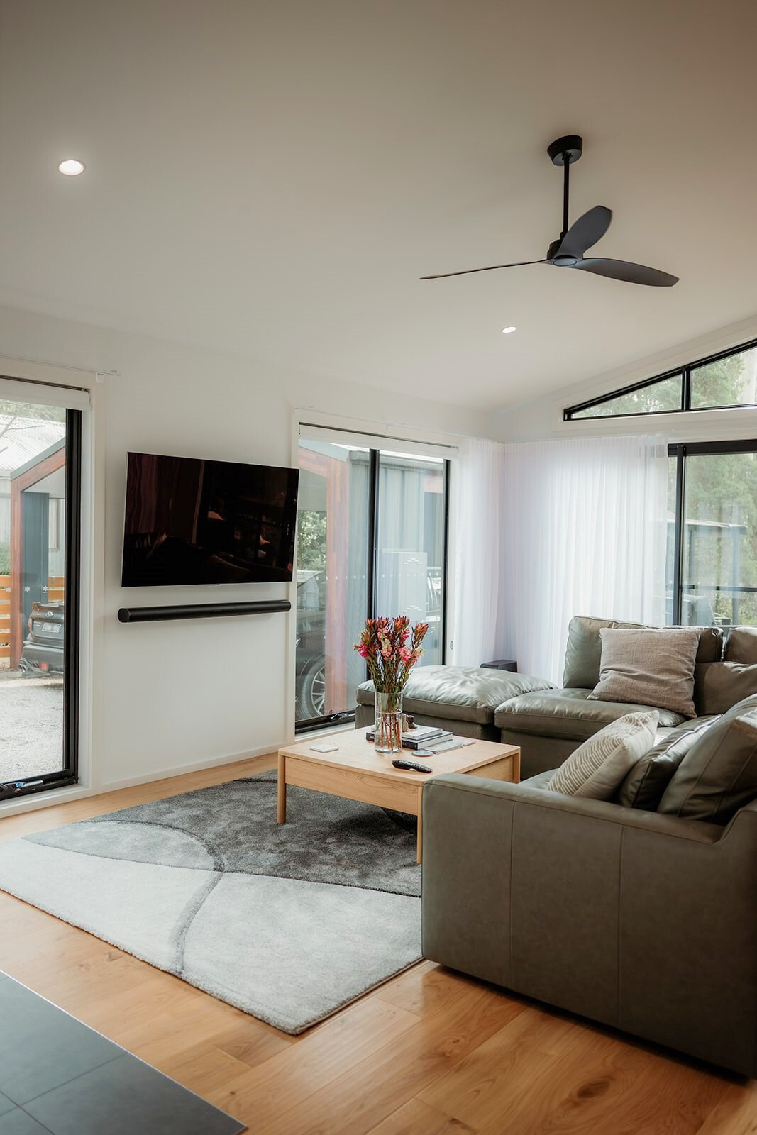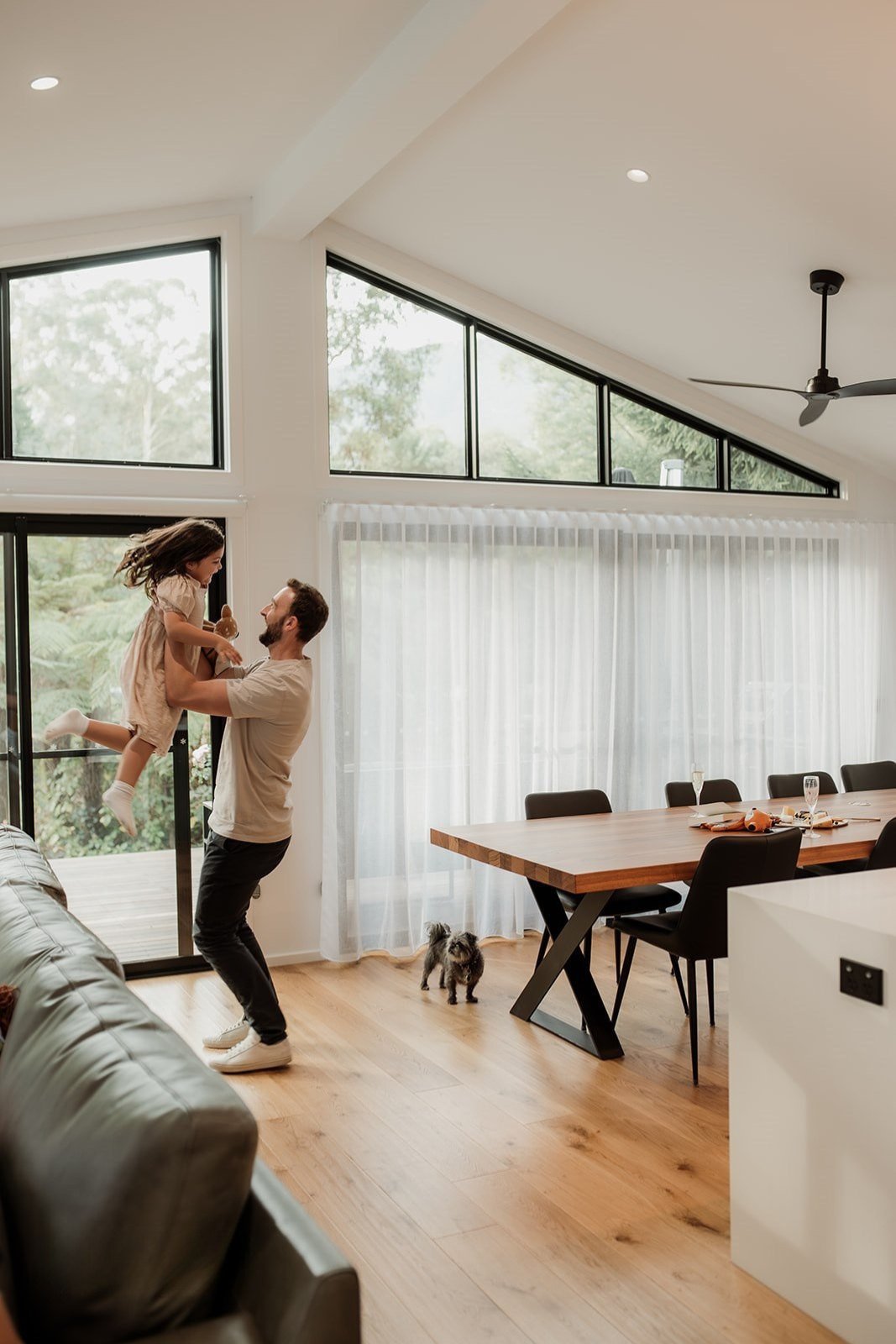 Set against the breathtaking backdrop of Warburton, this striking four-bedroom, two-bathroom home is a beautifully modified version of our Aspendale design. Featuring a refined Modern Gable façade, bold Spotted Gum and Nailstrip cladding, and soaring gable windows that invite the outdoors in, the home blends modern style with natural warmth. Expansive open-plan living connects seamlessly to a rear deck, capturing views of the Yarra Ranges and creating an ideal space for relaxed living and easy entertaining.