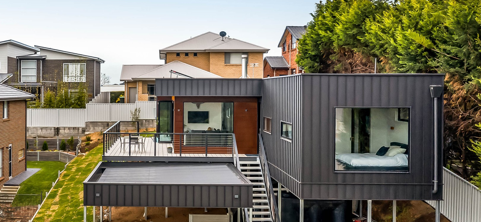 Located in the suburban area of Cordeaux Heights, just west of Wollongong, NSW, this distinctive modular design was crafted to fulfill our client's vision for their dream home. They sought a solution that could effectively address the challenges of a narrow, sloping block. The modular construction process offered the perfect fit, with its flexibility, rapid timeline, and reduced on-site disruption thanks to the off-site build.